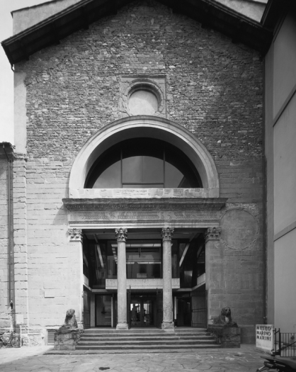 L'architrave corre e chiude tutto l'edificio e ospita una scritta dal vangelo di Marco ; le proporzioni delle lettere sono state studiate per rendere più eleganti e leggibili i caratteri e di sicuro i tanti disegni che l'architetto fece di dettagli delle opere antiche romane, qua rivivono.